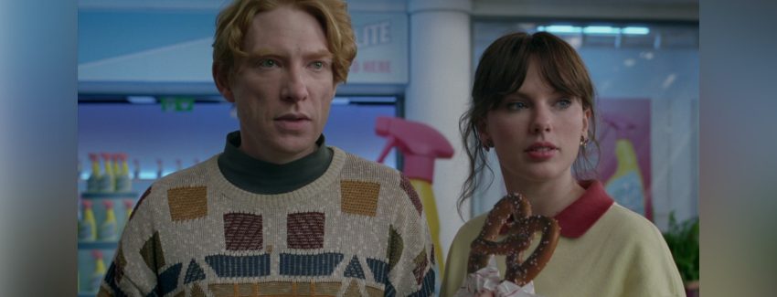 The video begins with a 1990s-era faux-commercial for a cleaning spray called Opalite, a product so apparently powerful it can “magically transform your problems into your paradise. Using our state-of-the-art chemical potion, it works on friendships, couples, pets and co-workers.” A pet rock also figures into the action, and the video ends with a spangly-attired Swift and Gleeson at a dance competition and then, over credits, a clip of the Graham Norton appearance.